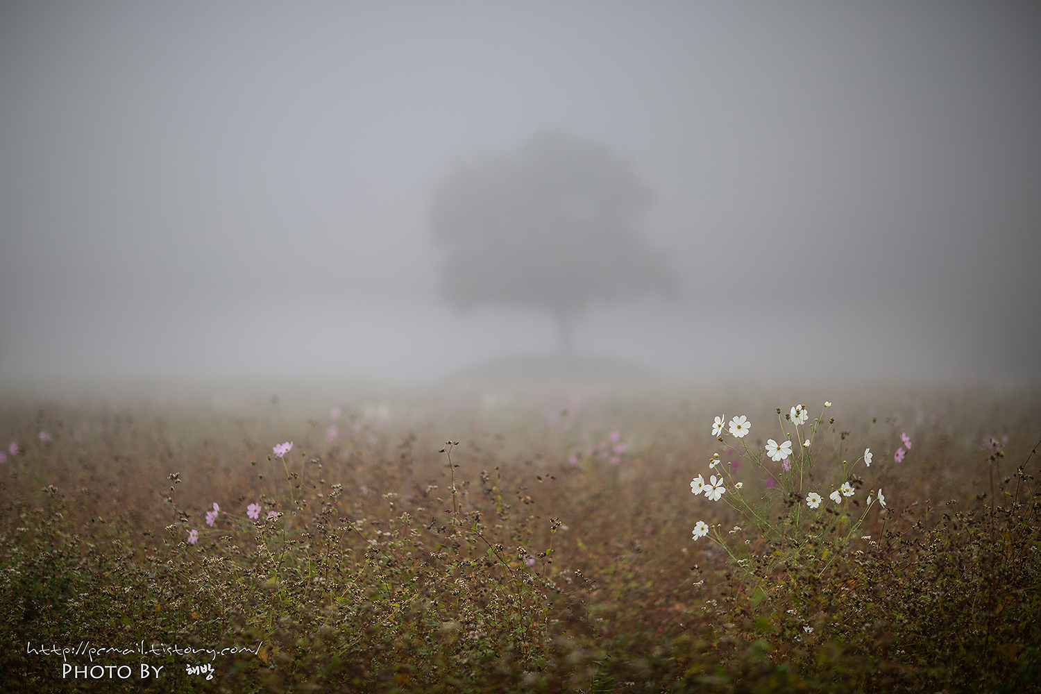 황화코스모스, 코스모스, 댑싸리 그리고 철 지난 메밀꽃들이 안개와 어우러져 몽환적인 느낌이었습니다.